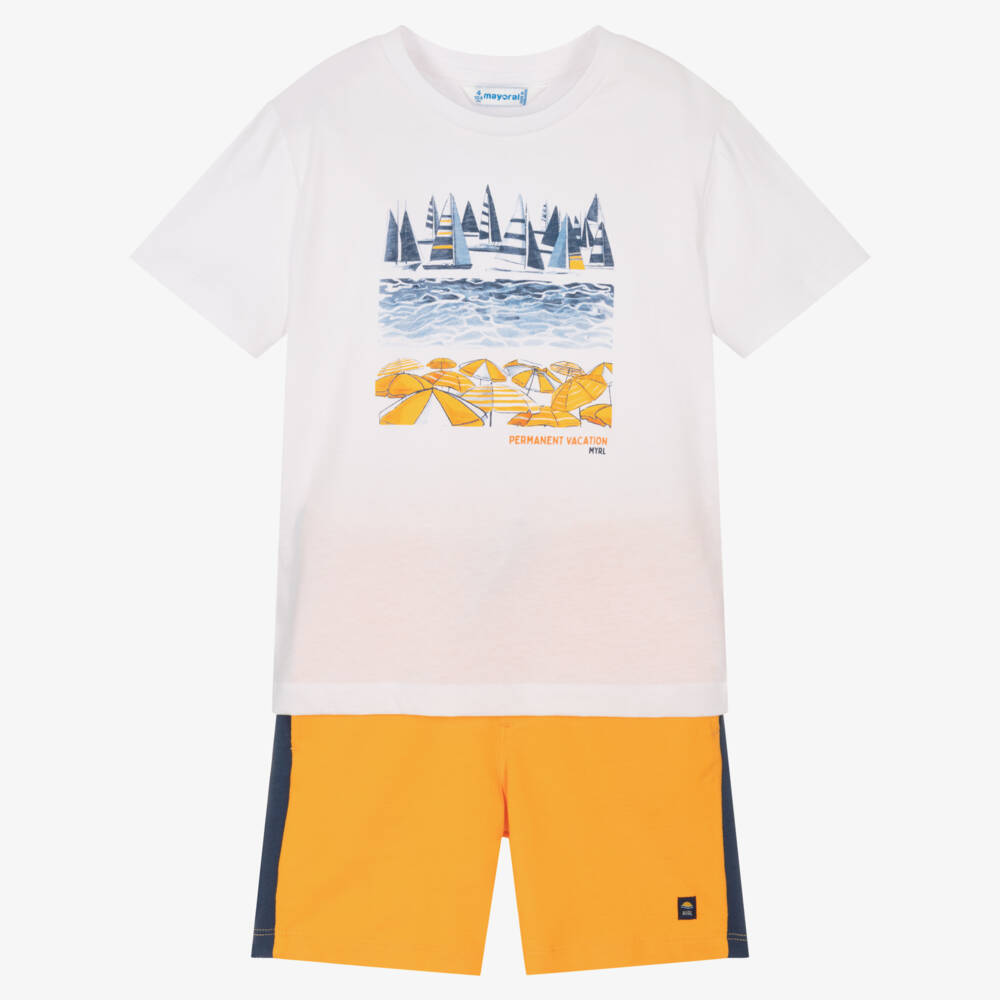 Casual white and orange cotton shorts set for boys by Mayoral. The white T-shirt has a blue and orange seaside-themed print with boats, umbrellas and the ocean. The bold orange shorts have navy blue side stripes and a small sunset logo tab by the hem. They are finished with three handy pockets and a drawstring waist.