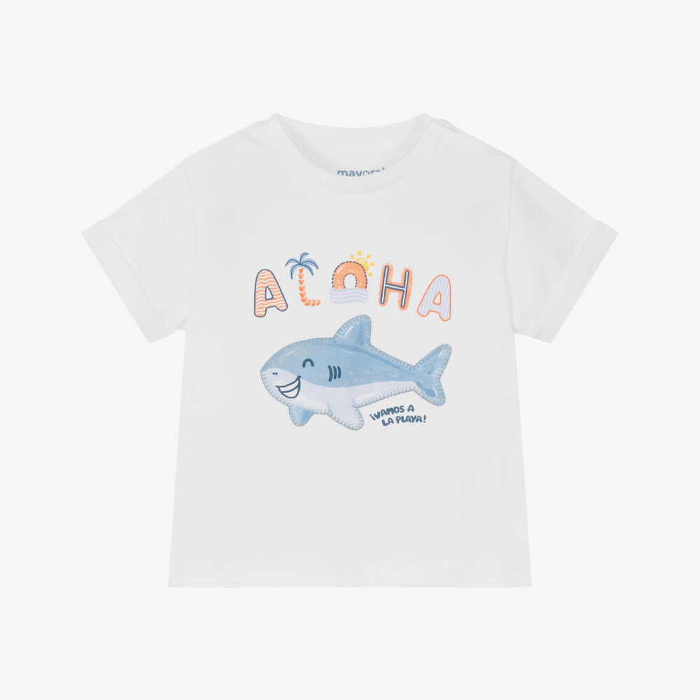 White cotton T-shirt for younger boys by Mayoral, made in comfortable jersey. It has a friendly shark design stitched on the front with an 'Aloha' slogan above. Poppers on one shoulder make it easier to get on and off over little heads.