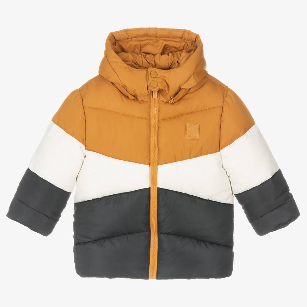 A silky soft puffer coat for little boys by Mayoral, in a mustard yellow, ivory and grey colourblock design. Fastening with a zip, this padded style has a detachable hood with popper fastenings that secure under the chin. Lined with warm teddy fleece, it has a small interior pocket and stretchy inner ribbed trims to keep chilly winds out.