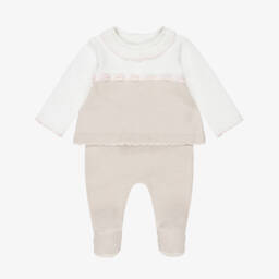 Cosy and warm for baby boys, this yellow cotton two piece babygrow is by Mayoral. With a soft fleecy inside, the jersey top has an adorable dinosaur appliqué on the front, and easy-to-use popper fastenings. Patterned in coordinating stripes, the trousers are made in soft velour, with a gently elasticated waist and enclosed feet.