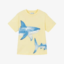 This yellow T-shirt for boys by Mayoral features a striking blue shark print on the front. It is made in soft cotton jersey, with a classic crew neckline, making it ideal for casual everyday wear.