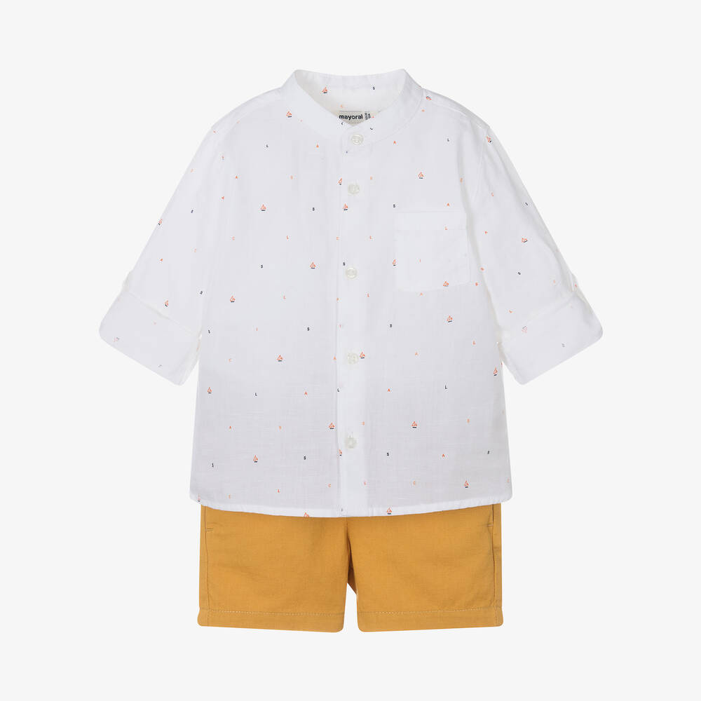 Smart-casual shorts set for little boys by Spanish brand Mayoral, made in a cool cotton and linen blend. The ivory, collarless, long-sleeved shirt is patterned with red and blue sailing boats and lettering. It fastens with logo buttons on the front and cuffs. The mustard yellow, twill shorts have an adjustable waistband for a good fit, fasten with a button and have useful, concealed side pockets.
