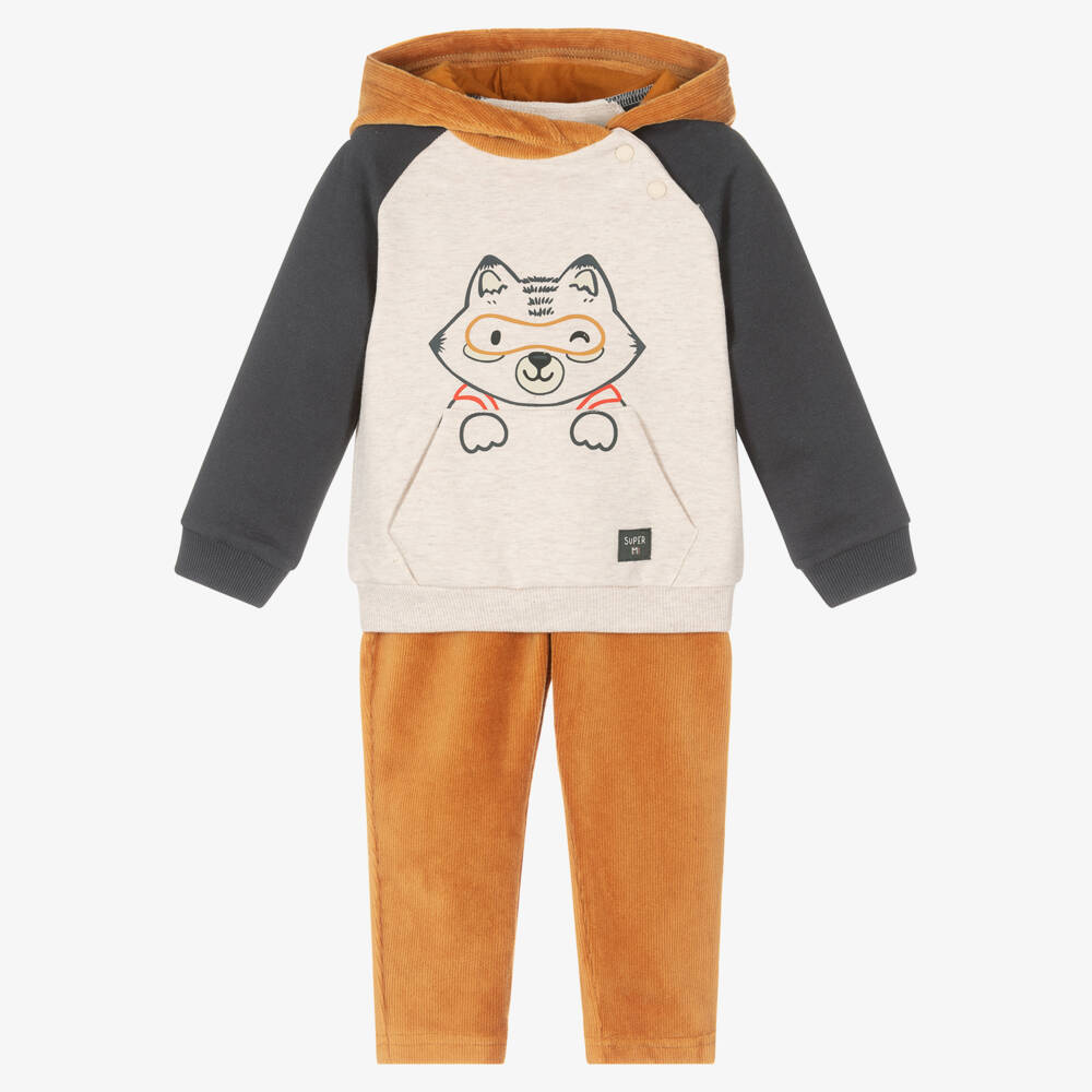 Mustard yellow and grey trouser set for little boys by Mayoral, made in a soft cotton blend. With a fleecy inside, the casual hoodie has grey raglan sleeves and a superhero animal print on the front. It has a fleece-lined pouch pocket on the front and easy popper fastenings on one shoulder. The corduroy hood coordinates with the regular fit bottoms, which are designed with front pockets and an adjustable drawstring waist.