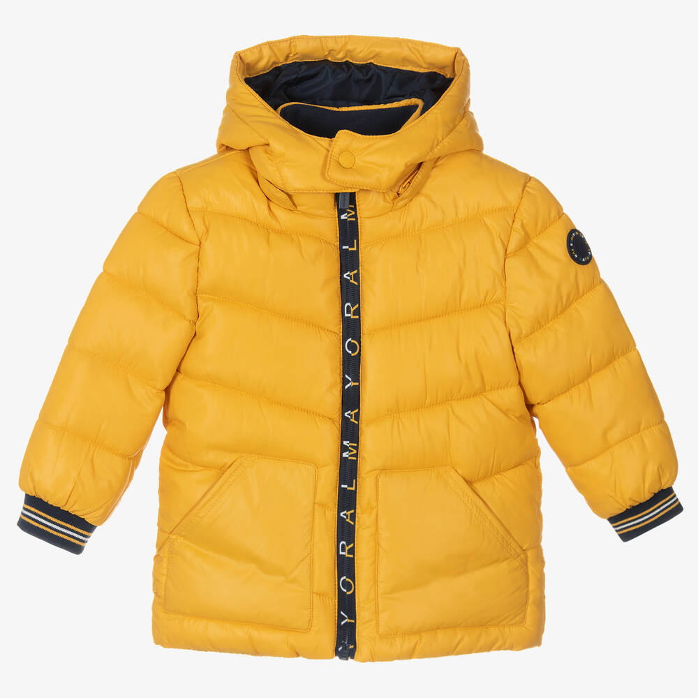 Yellow hooded puffer coat for little boys by Mayoral, made in silky smooth water repellent nylon. It has a useful detachable hood and a cosy polar fleece lining, helping to keep your little one warm. There is a blue, yellow and ivory logo trim on the zip placket and rubber logo patch on one sleeve. It has two front pockets and mid-weight padding.