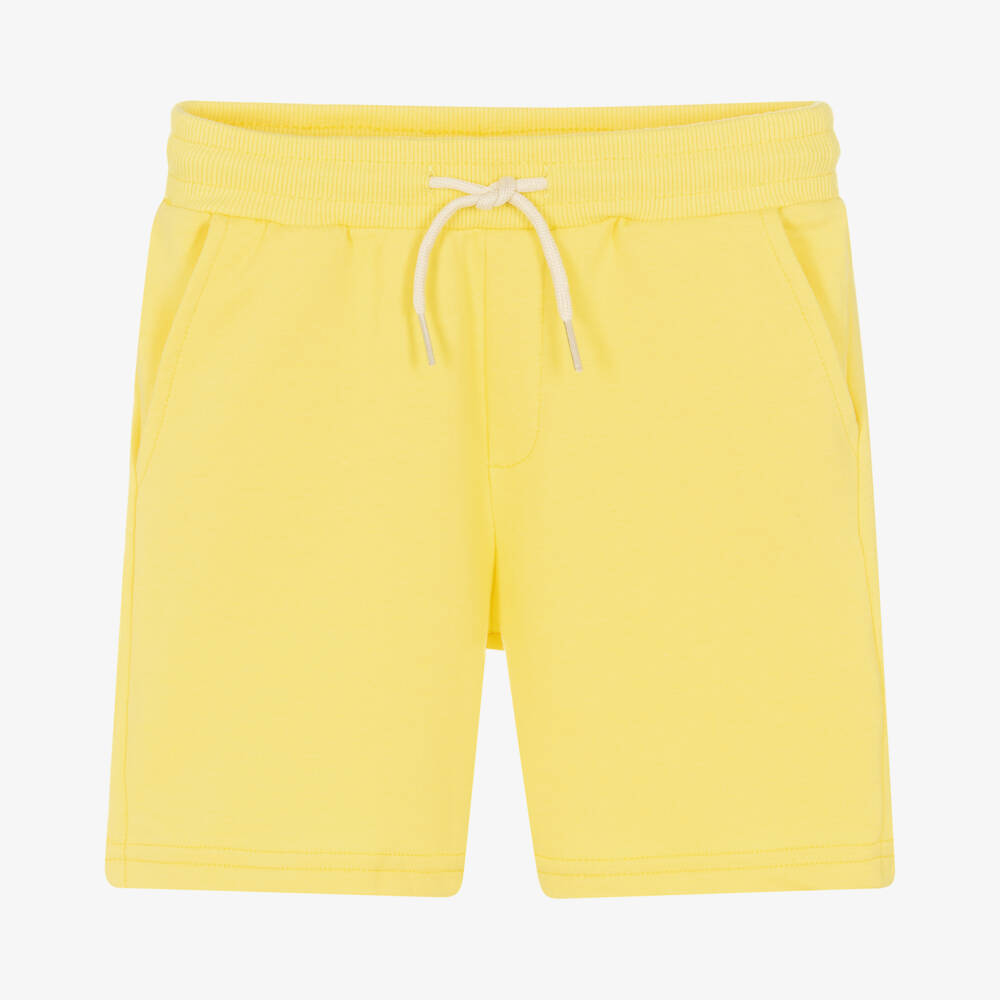 Bright yellow jersey shorts for boys by Mayoral, in a soft cotton blend. The waistband is elasticated with a drawstring tie for an adjustable fit and they have three useful pockets with a discreet logo patch on the back.