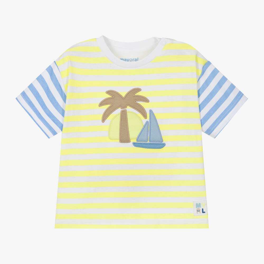 Yellow and blue striped T-shirt for little boys by Mayoral, made from soft cotton jersey. Great for casual styling, this short-sleeved top has a palm tree and sunset design embroidered on the front for a fun beach feel. It has a comfortable crew neck and easy popper fastenings on one shoulder.