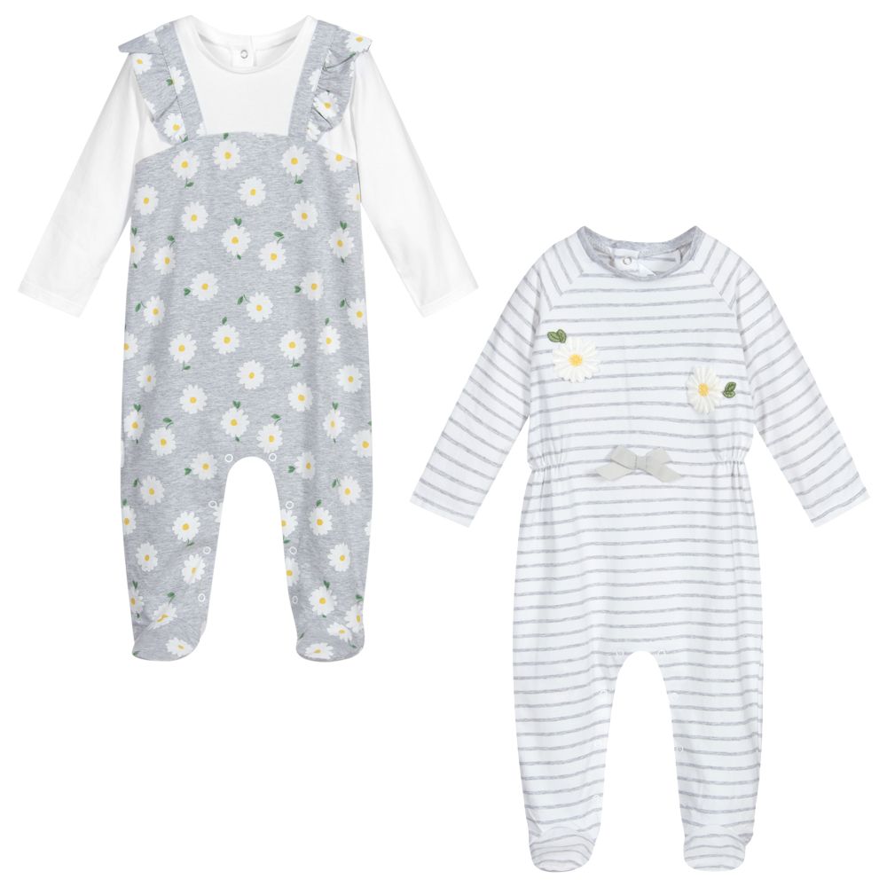 Pack of two grey and white babygrows for girls by Mayoral, made in soft cotton jersey. The striped babygrow has sweet daisy appliqués, a grey grosgrain bow detail and elasticated gathers at the waist. The grey dungaree-style babygrow has a pretty daisy pattern, shoulder ruffles and a white bodice.