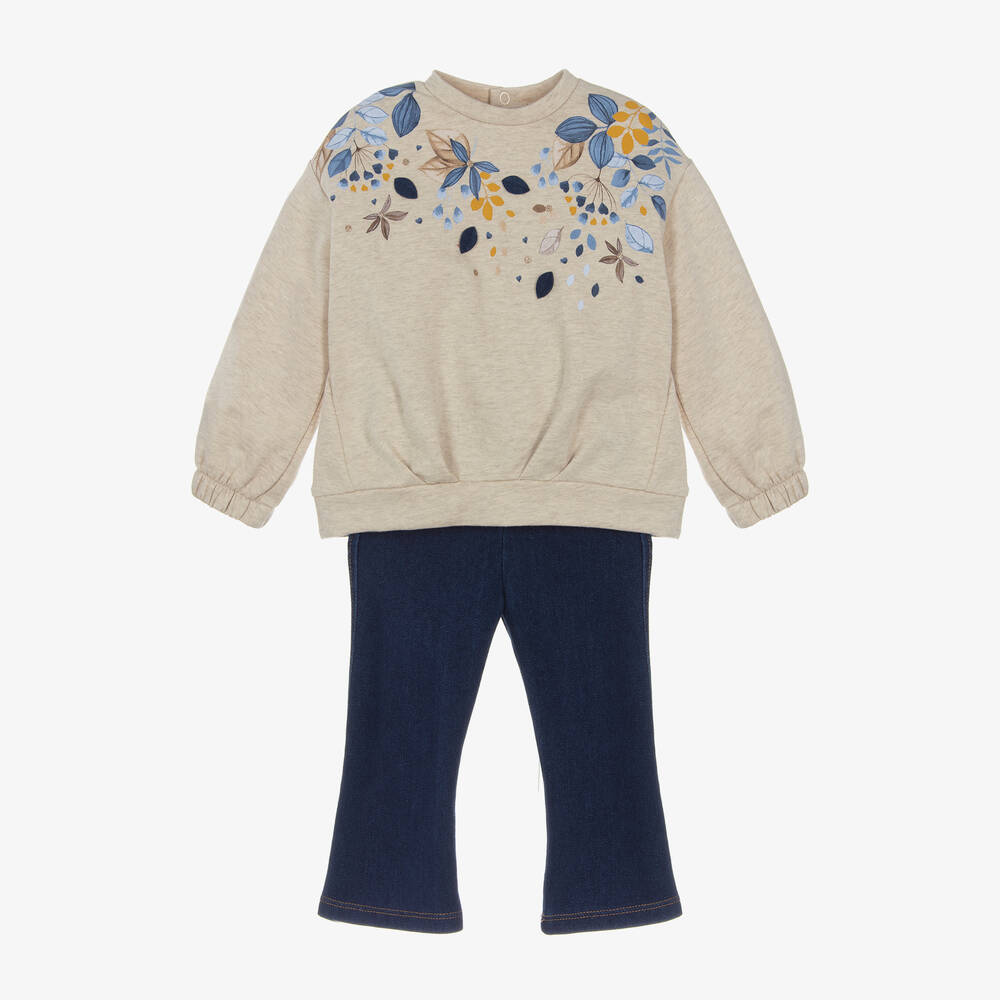 A beige and blue cotton jeggings set for little girls by Mayoral. Made from soft mid-weight jersey with a cosy fleecy interior, the sweatshirt has a pretty blue and yellow floral print with appliqué leaves and gold glitter accents. The long sleeves have stretchy cuffs and there is pleated detailing on the front. In the style of bootcut jeans, a pair of jeggings with a comfortable elasticated waist completes the outfit.