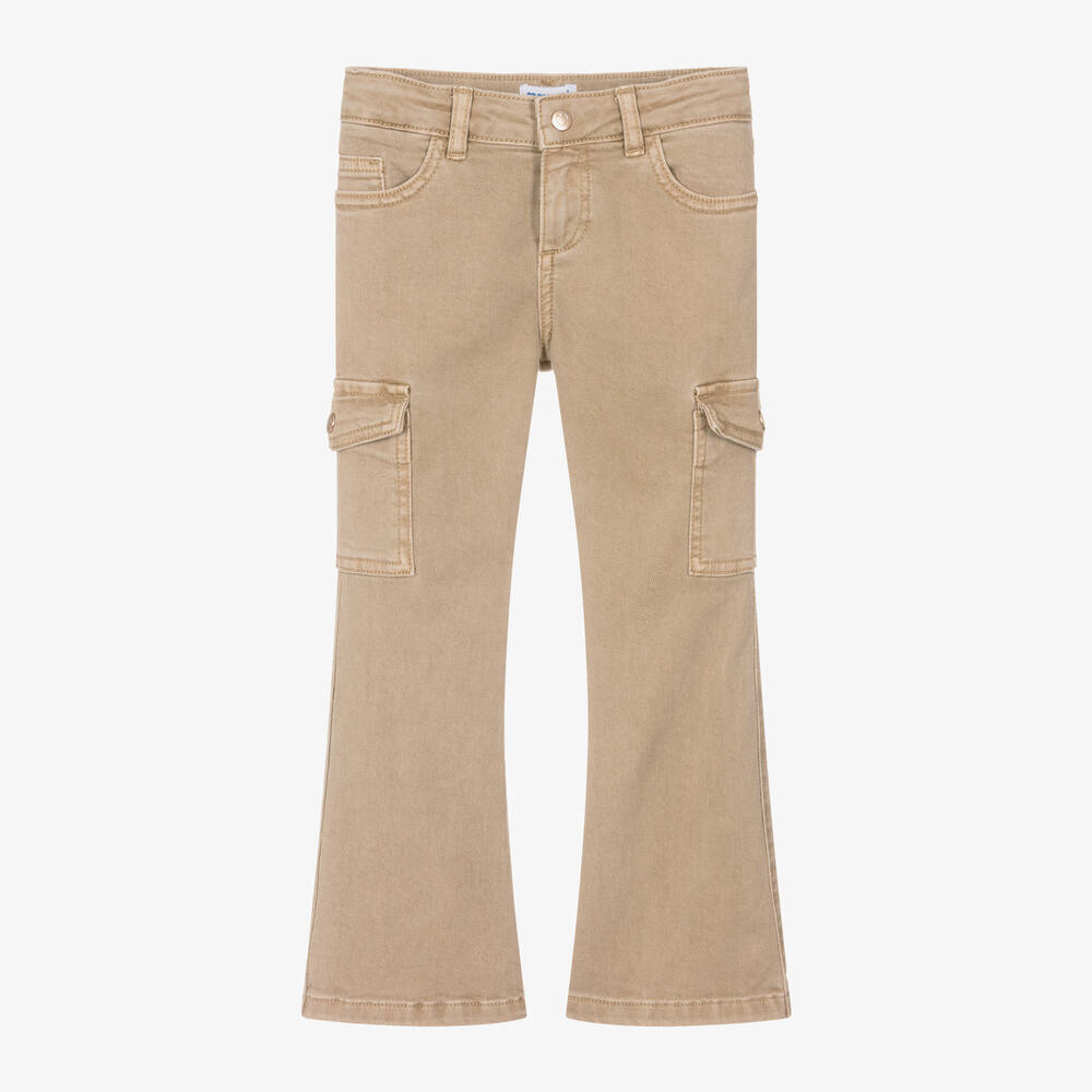 Stylish beige jeans for girls by Mayoral, with a flared leg and cargo-style pockets for a cool, retro look. A classic five-pocket design, they are made in stretchy denim for comfort. They fasten with a zip and popper and have an adjustable waist for a great fit. There is a logo jacron on the back waist and the gold-tone poppers and studs are branded with hearts.