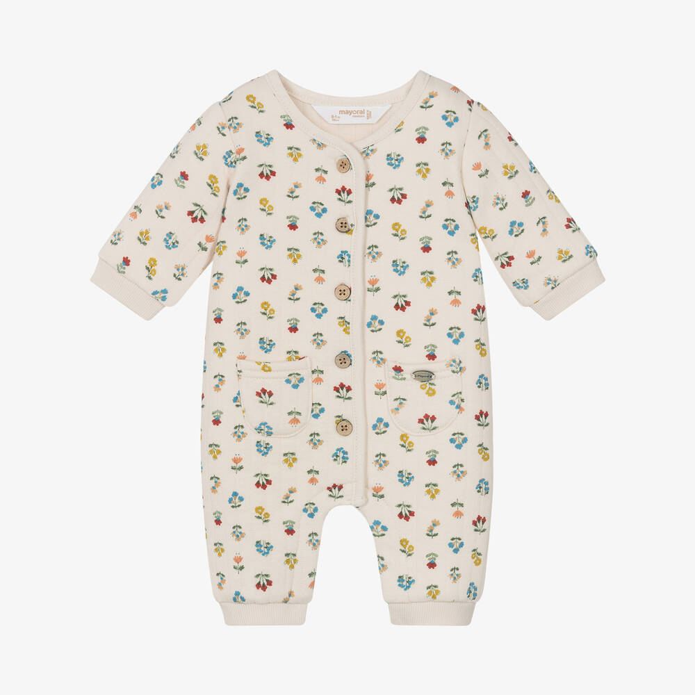 Pretty beige cotton blend romper for baby girls by Spanish brand Mayoral, with a colourful floral print. Made in comfortable jersey with stitched stripes, it has sweet patch pockets on the front and cosy, ribbed trims. There are button fastenings on the front and poppers between the legs for speedy dressing.