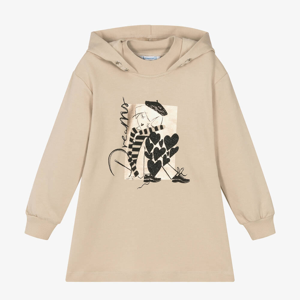Beige sweatshirt dress for girls by Mayoral, made in soft, mid-weight cotton jersey with a warm, fleecy inside. This cute hooded dress has a gentle A-line shape, with cosy ribbed trims. There is a sweet girl graphic printed on the front in metallic gold, with sparkling black hearts and 'Dreams' detailing.