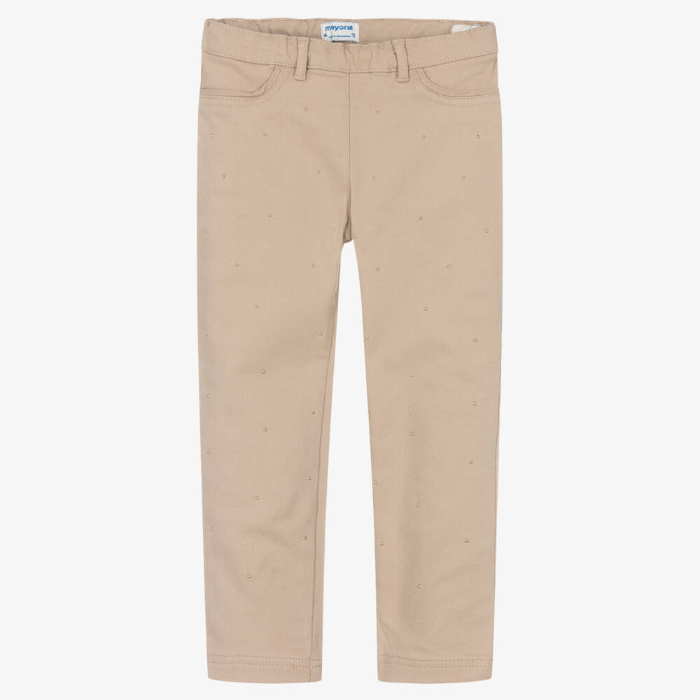 Beige trousers for girls from Mayoral, in a slim fit. They are made in soft, stretchy and medium-weight cotton for comfortable wear. They have faux front pockets, golden studs scattered across the front, and a metal logo and embroidered heart details on the back pockets. The waist is adjustable for the ideal fit.