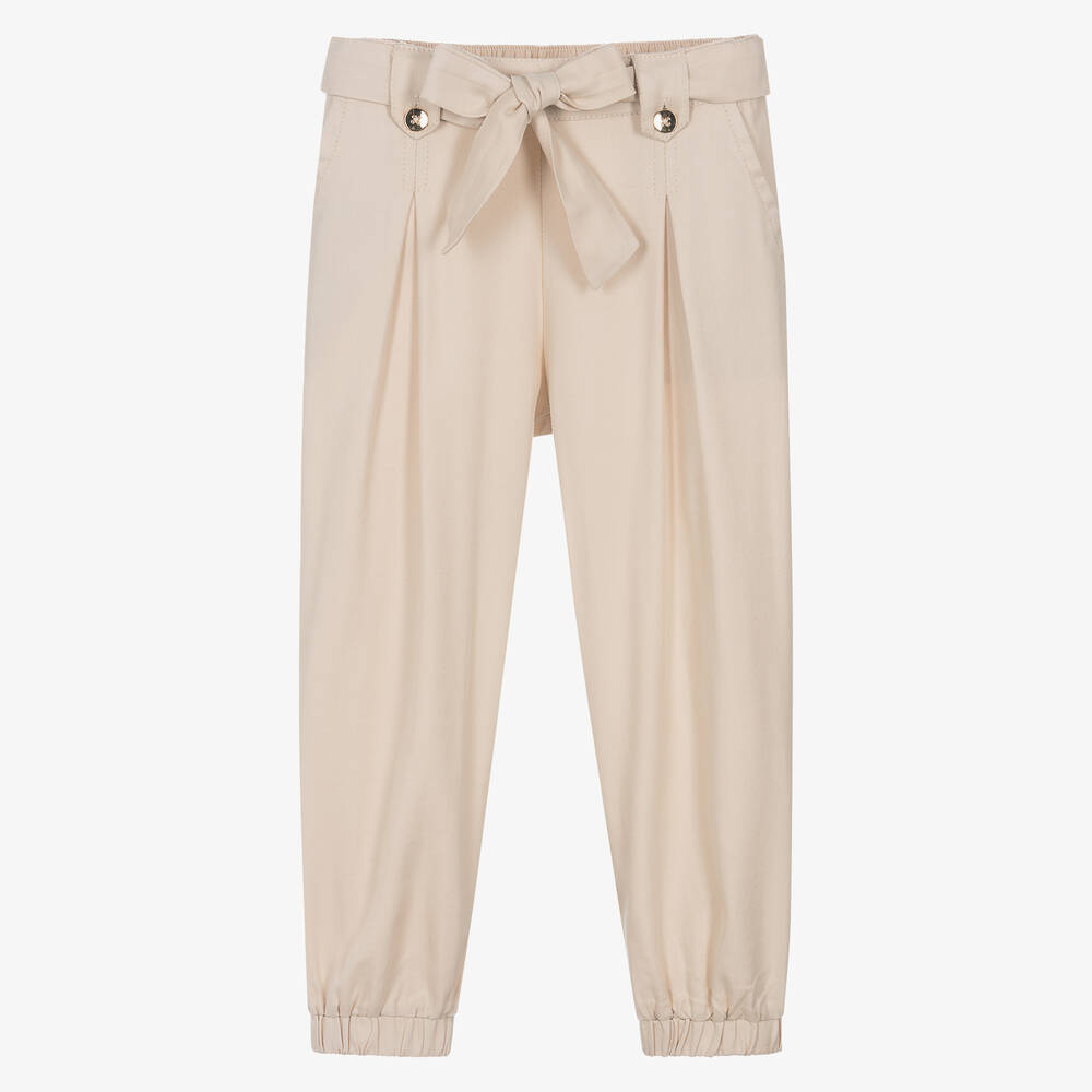 Light beige trousers for girls by Mayoral, made in a soft, lightweight cotton and lyocell blend. They have inverted pleats on the front, with elasticated cuffs and slanted front pockets. These casual trousers have a partially elasticated waist, with shiny gold, button-fastening belt loops and a tie fastening in a bow at the front.