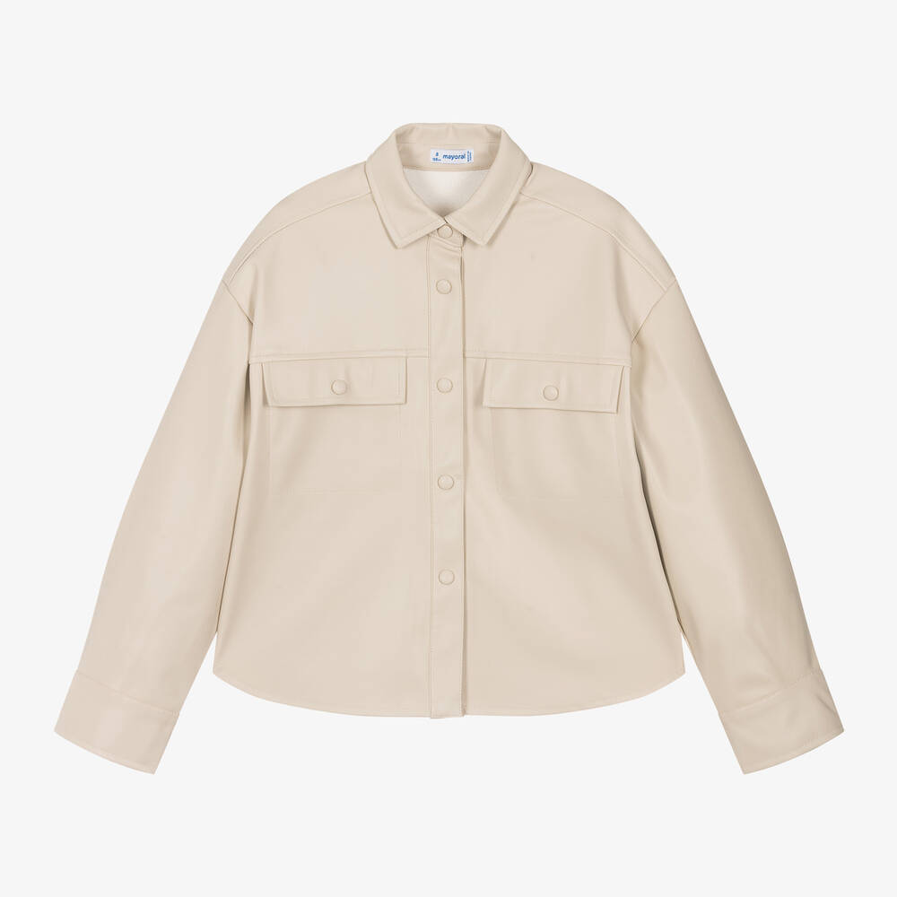 Beige faux leather overshirt for older girls by Spanish brand, Mayoral. Ideal for layering, this long-sleeved style has popper fastenings, chest pockets and a shaped hem.