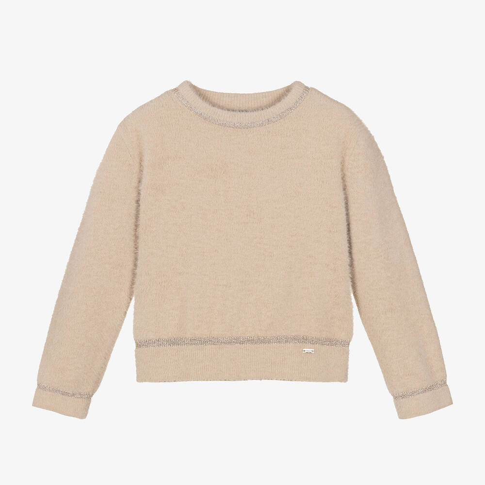 Beige sweater for girls by Mayoral, made in a soft, fluffy knit. Casual and comfortable, it has cosy ribbed trims and glittery striped trims for a glamourous touch.