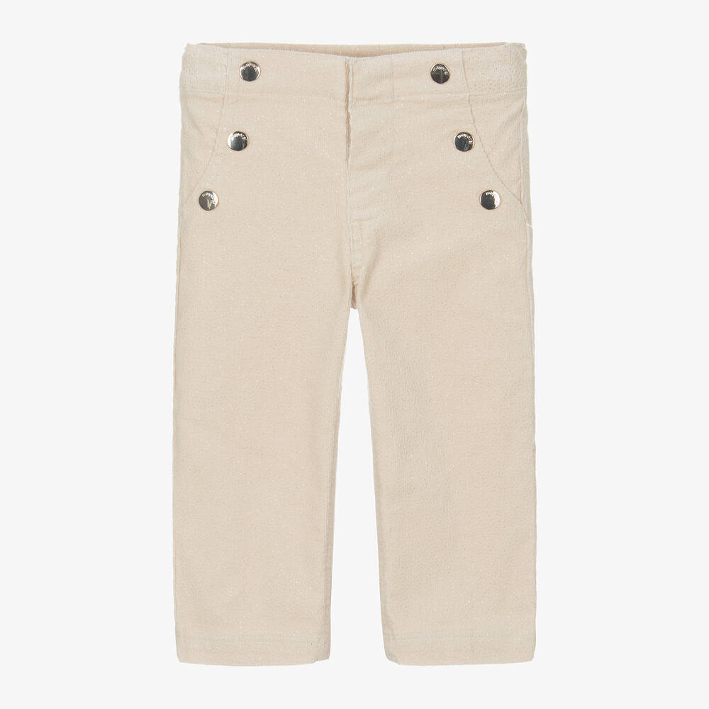Girls light beige trousers by Mayoral, made in fine cotton needlecord with a glittery silver finish. These gorgeous trousers have a wide leg silhouette with decorative gold buttons on the front. The popper-fastening waistband is fully adjustable for a comfortable fit and feel.