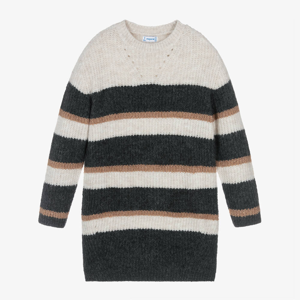 Beige and dark grey striped sweater dress for older girls by Mayoral. Made in a soft knit, it has beige stripes with metallic gold threads for a glittery look. Casual and comfortable, it has long sleeves and cosy ribbed trims.
