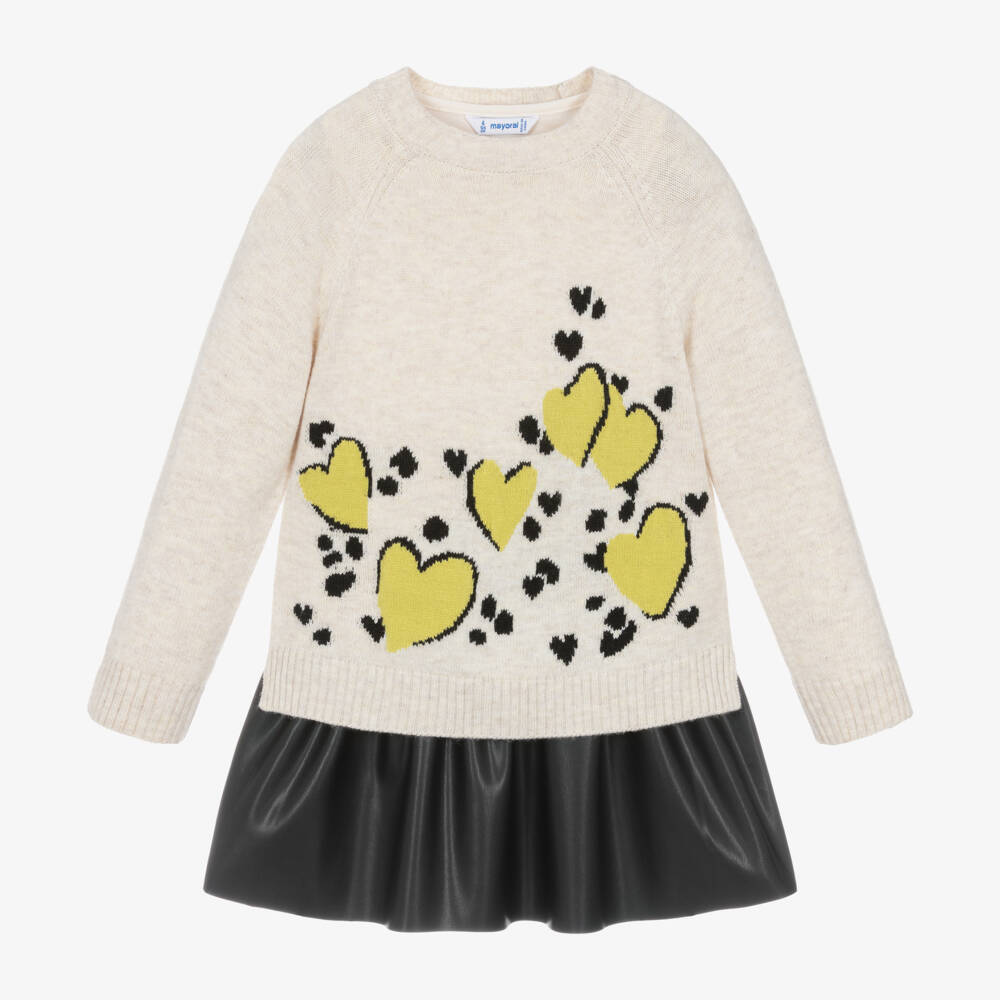 A light beige and black dress set for girls by Mayoral, combining soft jersey with a wool-blend knit for easy layering. The sleeveless dress has a round neckline and a faux leather skirt for a contrast in texture. It comes with a long-sleeved sweater, knitted with black and yellow hearts, which can be worn over the dress for a different look.