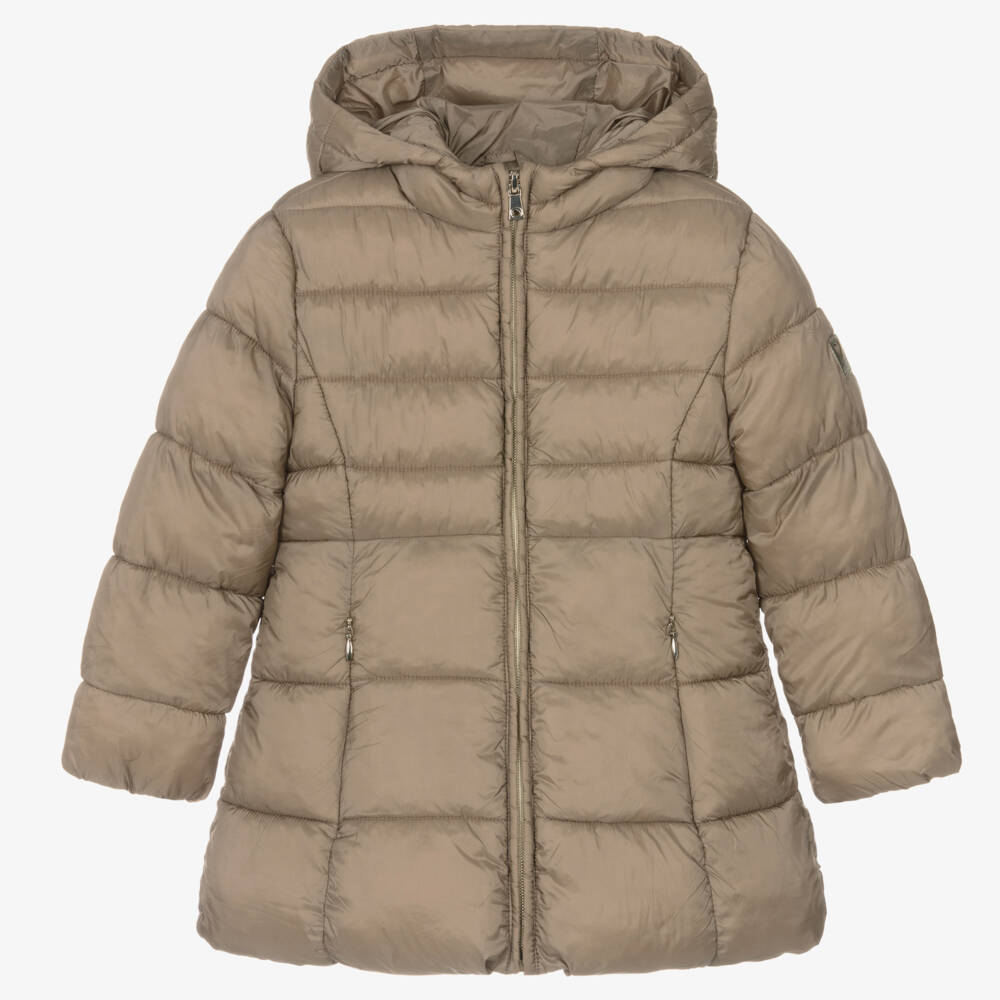 Beige hooded puffer coat for girls by Mayoral, made in silky smooth fabric. Cosy yet lightweight, it is warmly padded and has a soft plush lining. The coat fastens easily with a zip and has secure, zip-fastening front pockets. This item contains recycled fibres.