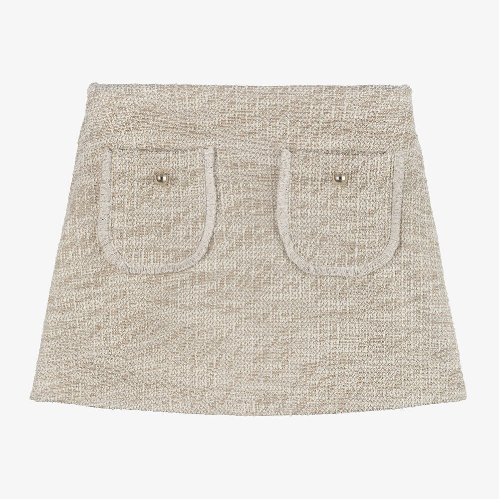 Beige and ivory tweed effect skort for girls by Mayoral. It is made in a mid-weight, cotton blend jersey with glittery threads for added sparkle. Casual but stylish, it has patch pockets on the front, trimmed with pretty frayed detailing and faux buttons. It has a useful adjustable waist for a comfortable fit.