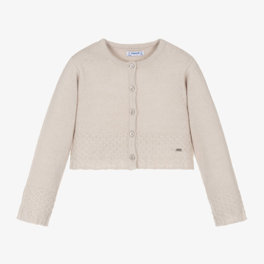 Beige cardigan for girls by Mayoral, with a pretty pattern around the hem and cuffs. Lovely for layering when the weather turns chilly, it is knitted in a beautifully soft wool blend and is designed to sit neatly on the waist. There are pearlescent diamanté button fastenings on the front, with a branded metal plate near the hem.