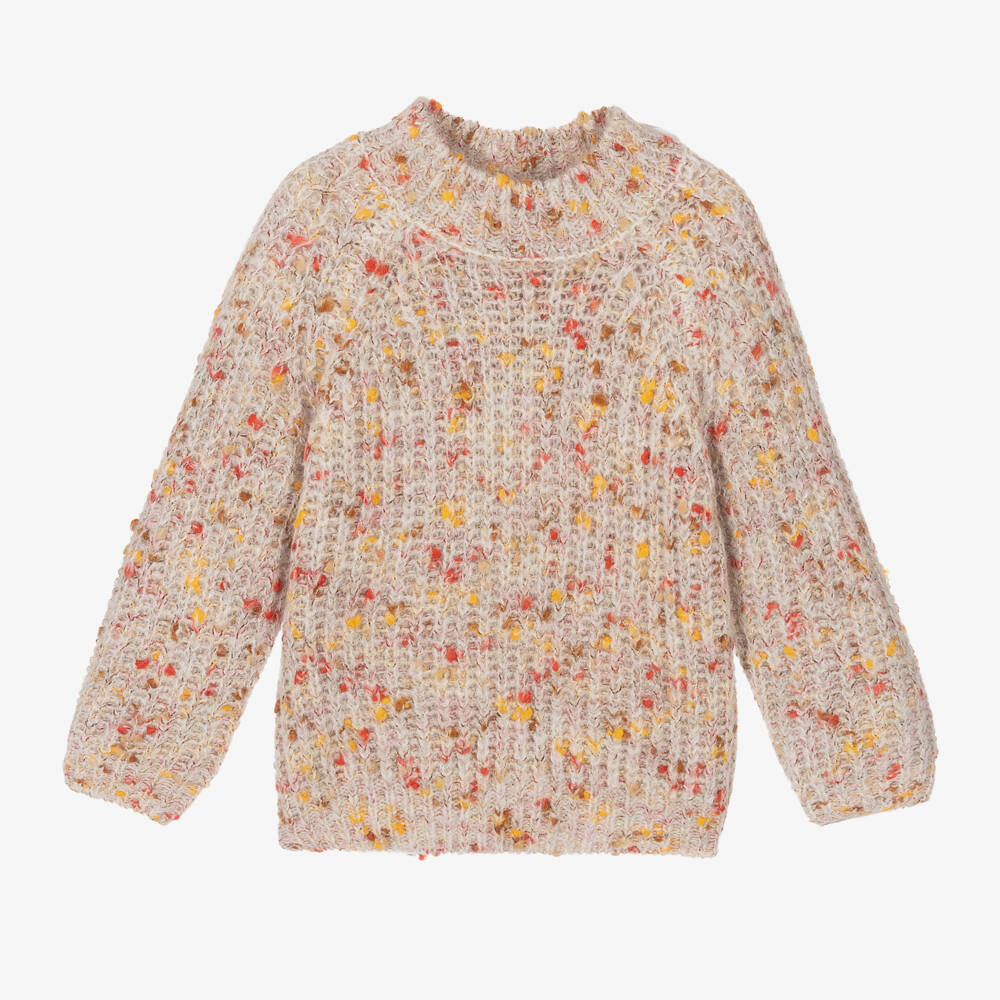 Gorgeous beige sweater for girls by Mayoral. Made in a soft and chunky knit, it has a brown, yellow and pink speckled pattern, and a high-neck ribbed neckline.