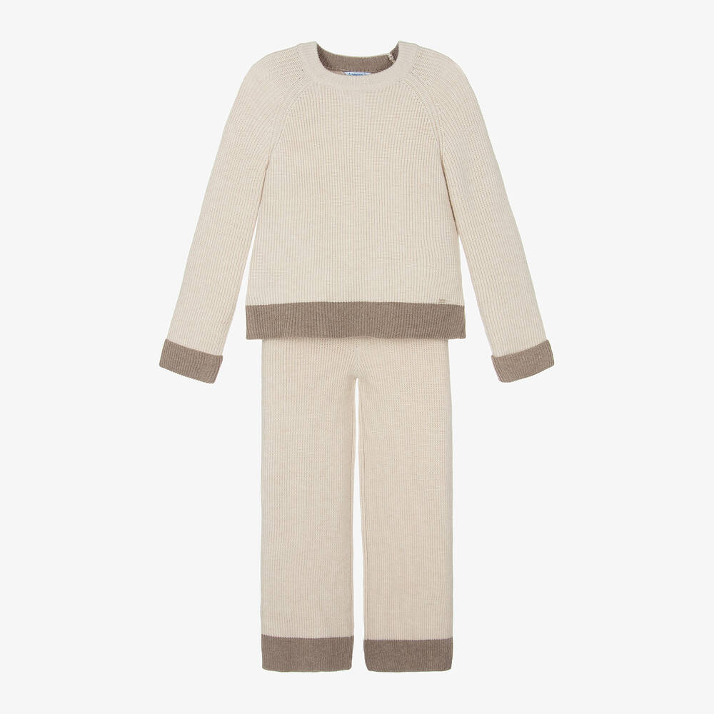 Beige trouser set for older girls by Mayoral, detailed with a logo plaque. Knitted in a soft mix with viscose, this stylish set has complementary brown trims. Lovely for laid-back days, the sweater has fixed fold-over cuffs and the wide-leg trousers have an elasticated waist. These items contain recycled fibres.