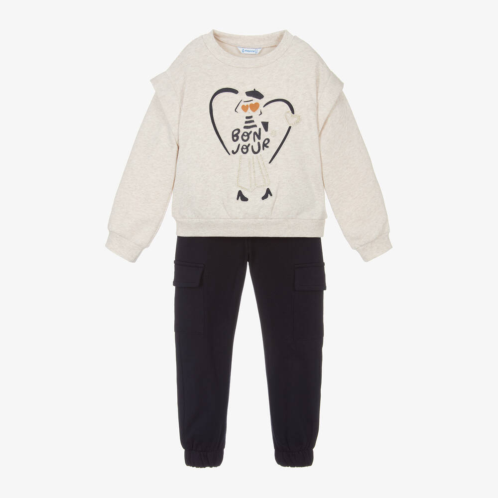 In beige marl and navy blue, this casual tracksuit for girls by Mayoral, is made in soft cotton-blend jersey. With layered-look long sleeves, the comfortable top has stretchy ribbed trims and a raised 'Bon Jour' design on the front with glittery gold accents. The navy blue joggers have cargo-style pockets on each leg and a drawstring elasticated waistband for an ideal fit.