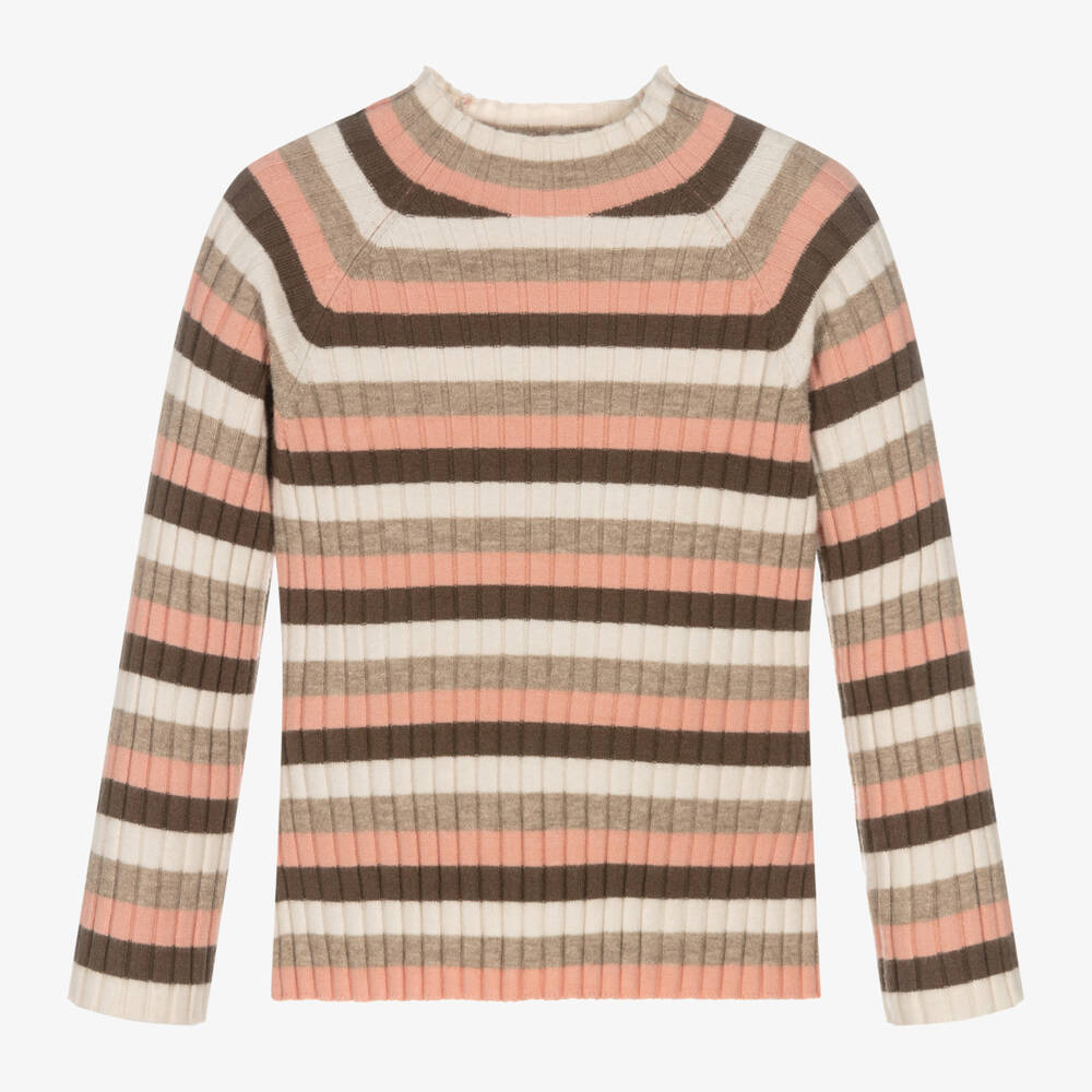 A lovely turtleneck top for girls from Mayoral, in dusky pink, beige, brown and ivory stripes. Made in a ribbed, viscose blend knit, this fitted top is super soft and stretchy.