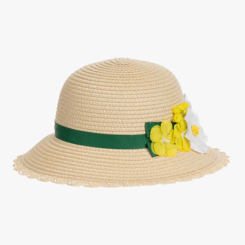 Charming beige straw hat for girls from Mayoral. This pretty hat has cute floral appliqués on the side with a green ribbon trim. It has a brim with a sweet scalloped edge, to help keep the sun out of little one's eyes.
