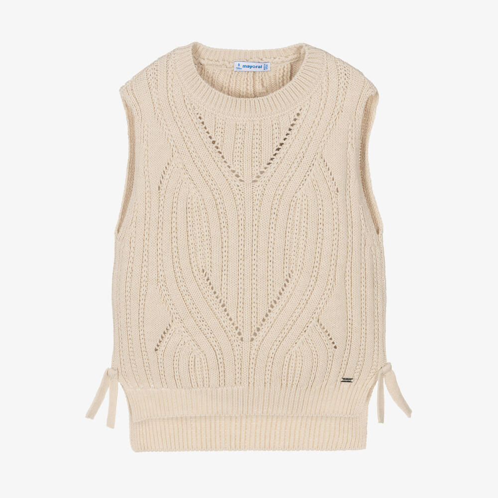 Trendy light beige sweater vest for girls by Mayoral, knitted from a chunky acrylic polyester blend. It has a cable knit design, with ties on the sides and a small silver logo tab above the hem, for a subtle branded finish.