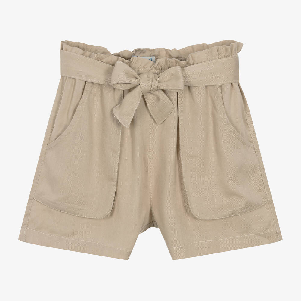 Beige shorts for older girls by Mayoral, made from beautifully soft viscose. Casual and lightweight, they are styled with deep pockets on the front and a stretchy elasticated waistband for easy pull-on. A fixed belt ties neatly on the front to complete the stylish look.