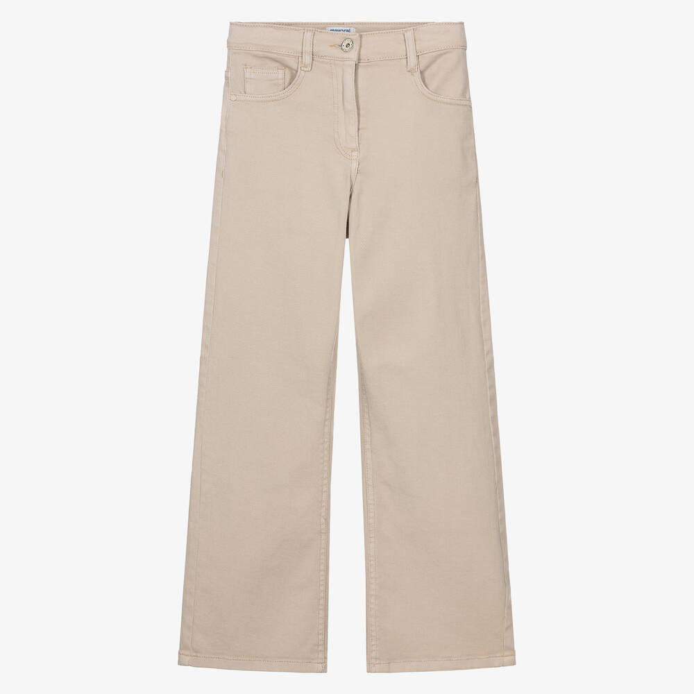 Stylish beige wide-leg jeans for older girls by Mayoral, made in soft recycled denim with a slight stretch for comfort. They are simply styled in a classic five-pocket design, with a gold logo jacron and a branded button.