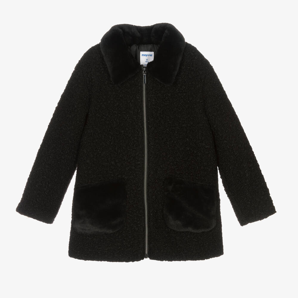 Black bouclé coat for girls by Mayoral, with a super soft faux fur collar and patch pockets. It has an exposed silver zip fastening on the front with logo pull tabs.