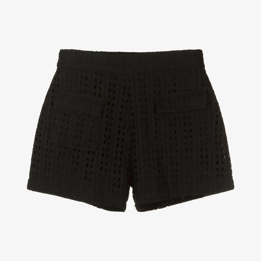 Stylish black Mayoral shorts for girls, made in cotton broderie anglaise and fully lined for comfort. They have patch pockets on the front and a concealed side zip fastening. The waistband is adjustable for a great fit.