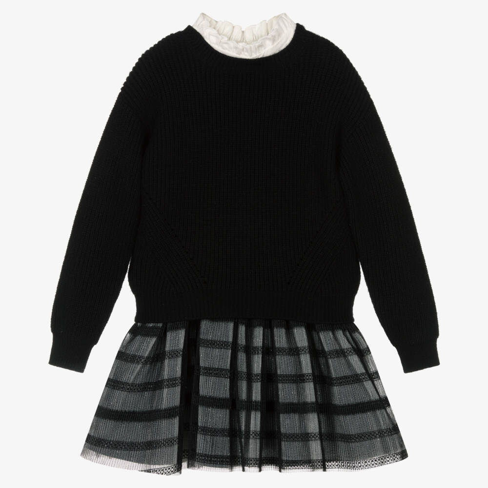 Black dress and jumper set for girls by Mayoral. The sleeveless dress has a soft cotton jersey bodice and a gathered tulle skirt in white and black, with glitter sparkle and patterned stripes. The viscose blend jumper has a softly knitted rib pattern and comes with a detachable white ruffled collar insert.