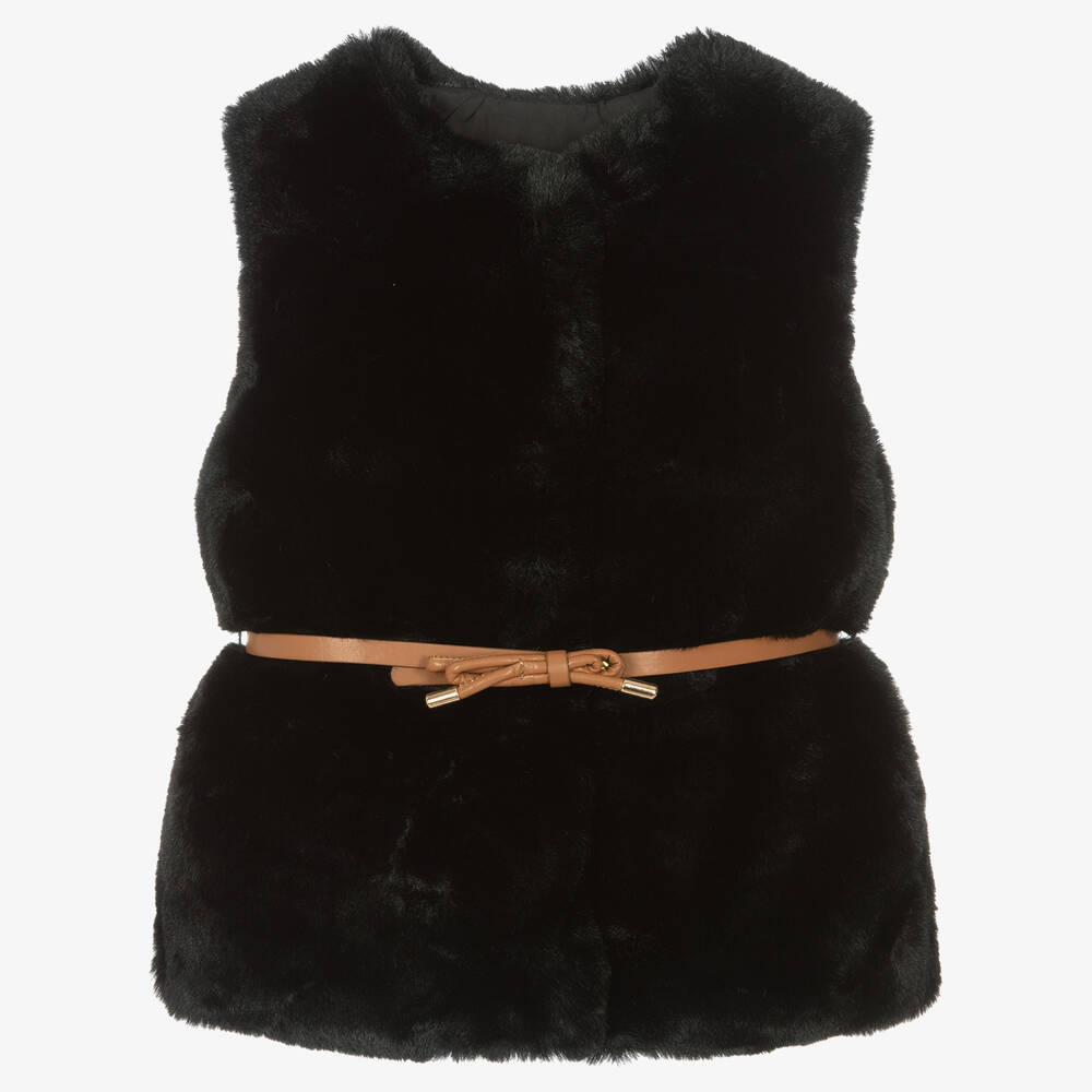 Super stylish black faux fur gilet for girls from Spanish brand, Mayoral. Beautifully soft, this long-line gilet comes with a detachable and adjustable tan brown faux leather belt for a chic silhouette. It fastens with discreet poppers and has a lovely beige satin lining.