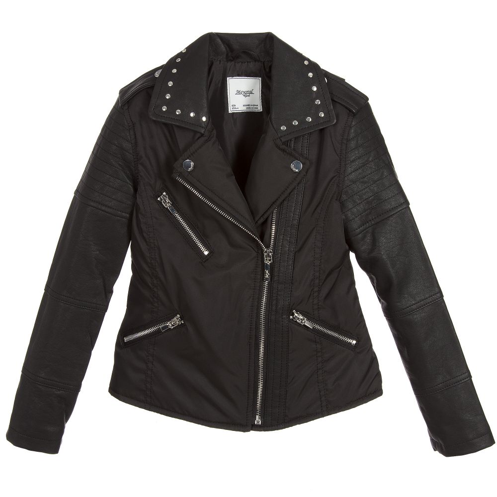 Girls black jacket, with zipped pockets and studded collar by Mayoral. It has faux leather arms, collar and epaulettes, and a woven polyester body. This slightly padded and fully lined jacket has the classic biker style asymmetric zip opening that can be turned back with poppers to make lapels.