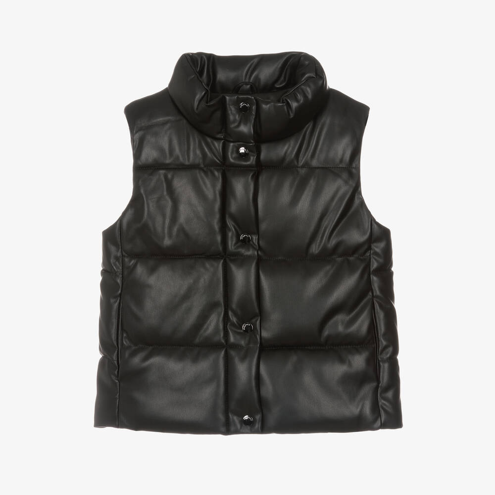 A black puffer gilet for older girls by Mayoral, with useful side pockets. This chic layer is made in soft faux leather, lightly padded, and lined with silky fabric. It fastens with complementary pewter-coloured poppers on the front. The hem can be adjusted using the inner drawcords, providing a customised shape and fit.