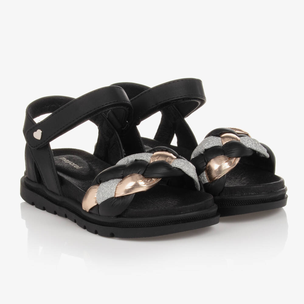 Girls black faux leather sandals by Mayoral. Decorated with a gold, silver and black plaited band across the toes, they have a velcro adjustable ankle strap and a deep tread, non-slip rubber outer sole. The inner sole is made from leather for comfort.