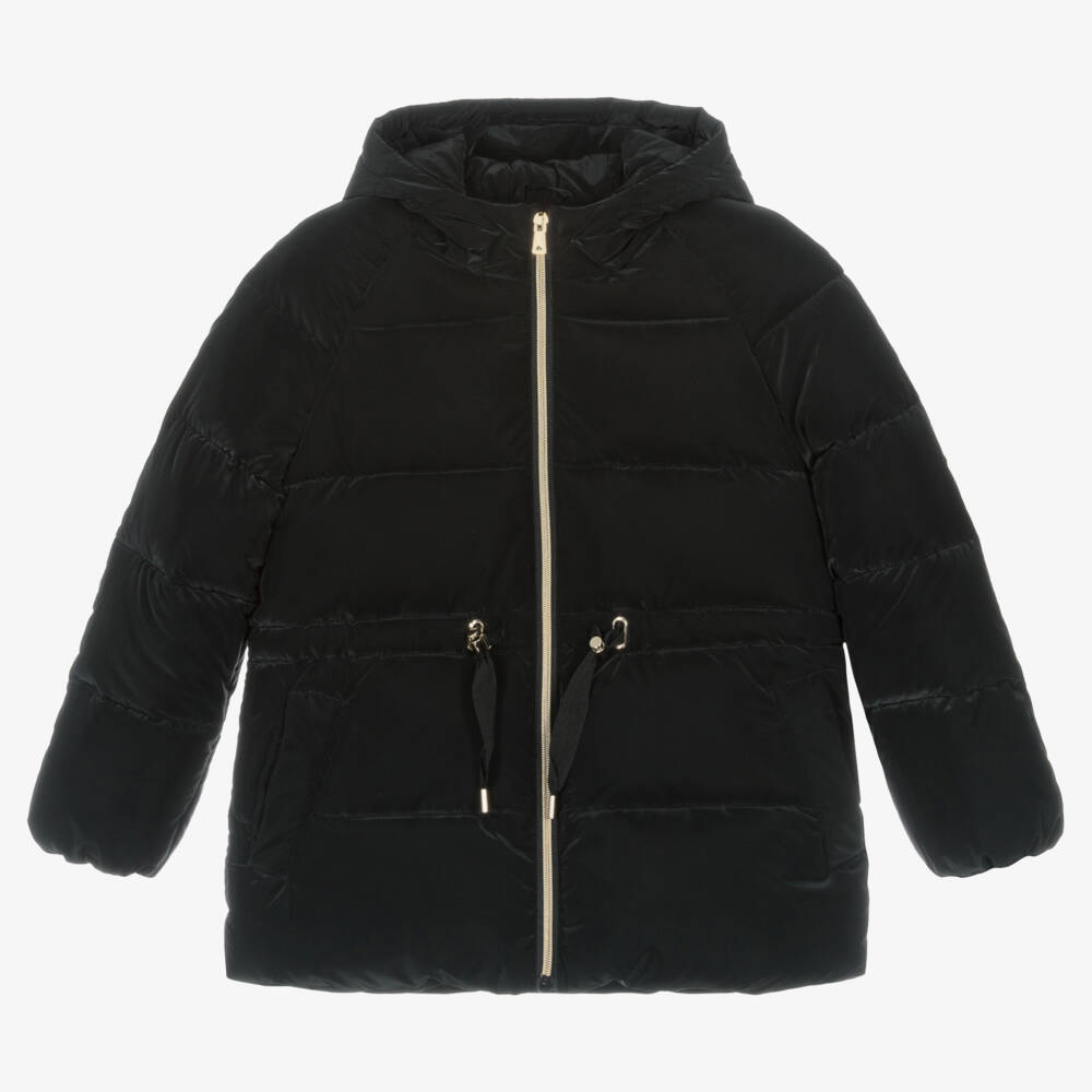 A black puffer coat for older girls from Mayoral, with gold-tone hardware. This hooded coat is made in silky soft fabric and padded with mid-weight insulation for extra cosiness. It has convenient front pockets, a soft polar fleece lining for warmth and a drawstring detail on the waist for the ideal fit.