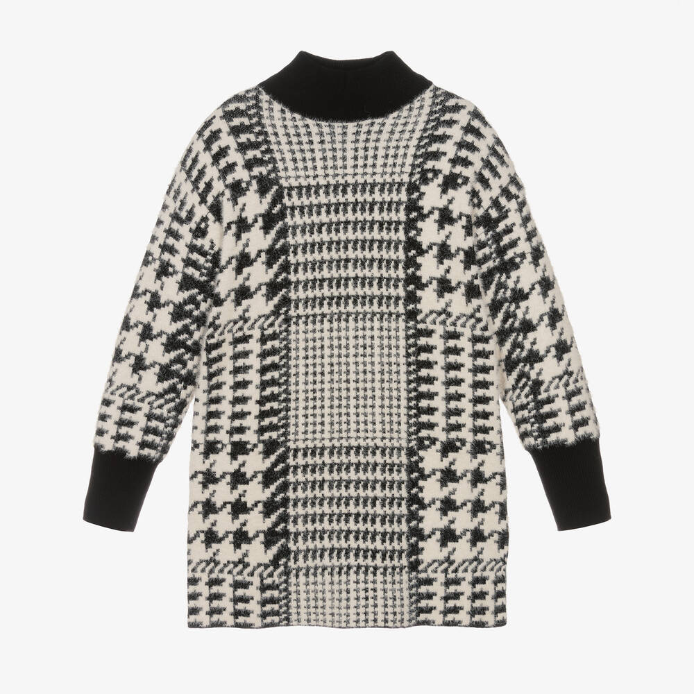 Black and ivory houndstooth check jumper dress for older girls by Mayoral. Beautifully soft and cosy, this viscose-blend knit has a lovely, fluffy finish. It is styled with a ribbed turtle neck and has matching ribbing on the cuffs. The hem has a small split on each side for comfort.