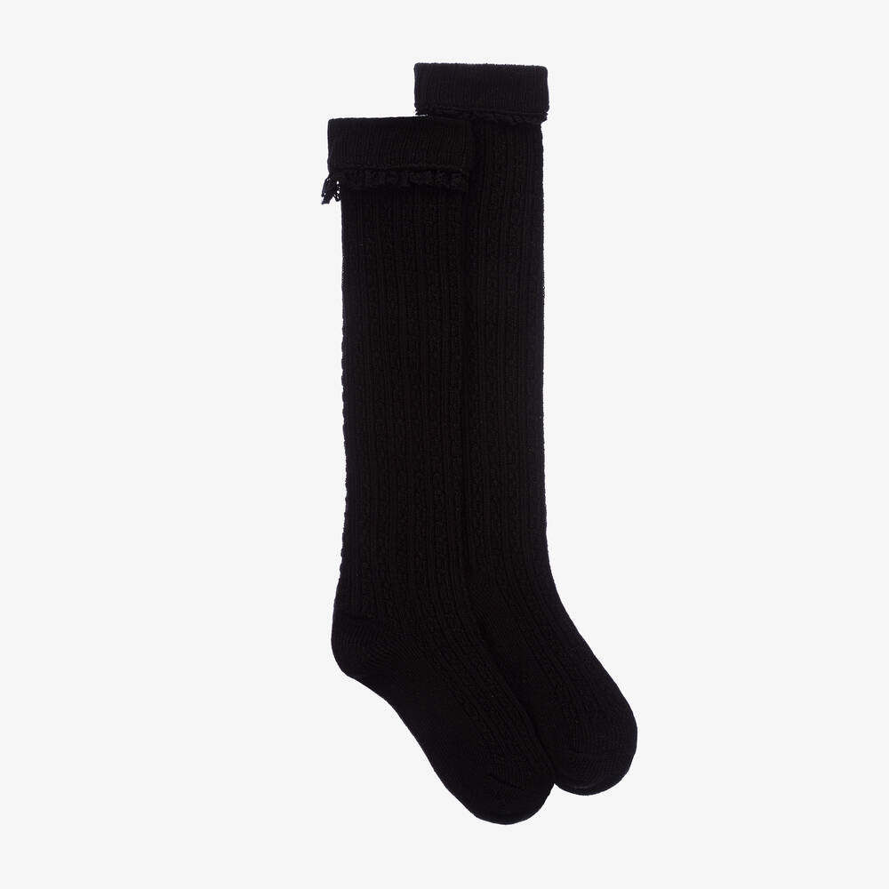 Black knee high socks for girls by Mayoral, knitted in a soft cotton blend. Stretchy and comfortable, they have a pretty cable knit pattern and a sweet lace trim on the turn-down cuffs.