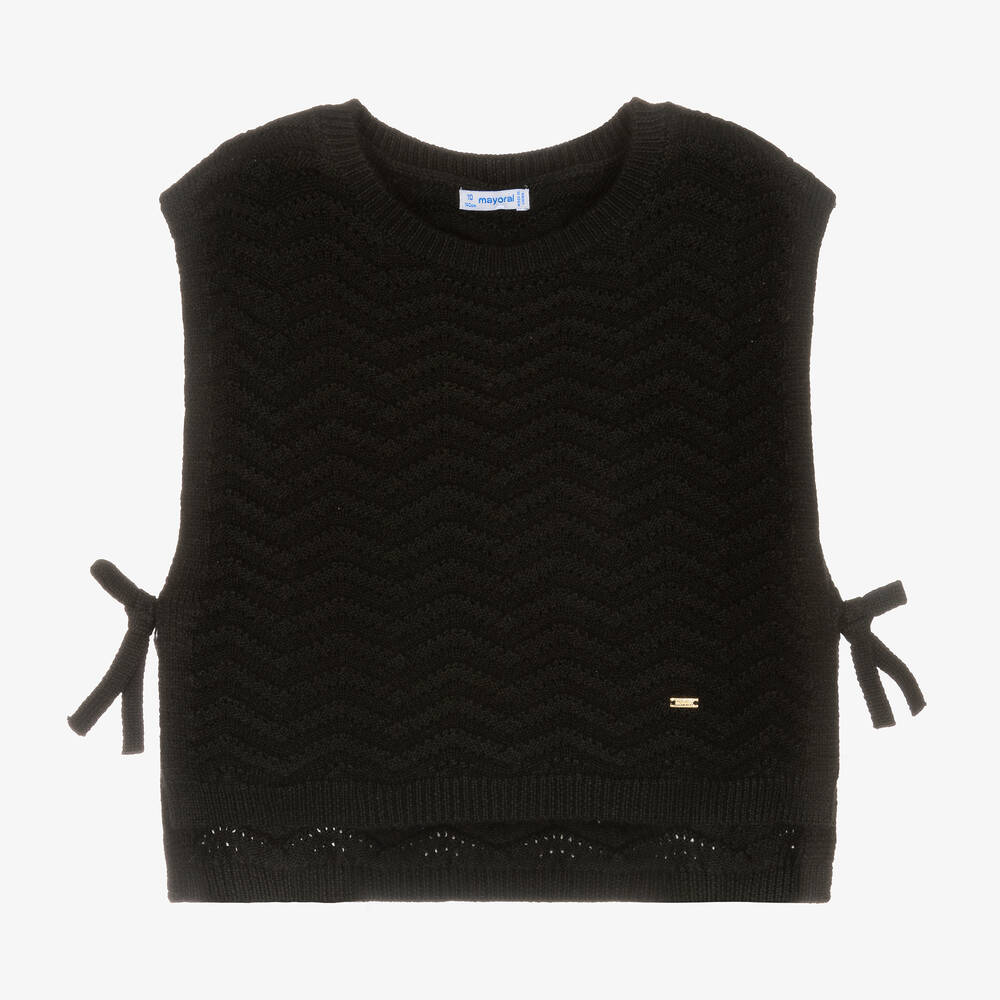 Lovely black slipover for older girls by Mayoral, knitted in a soft viscose blend. It has a pretty chevron design and ribbed trims. The back is longer than the front and there are fixed bows on the sides. This stylish, sleeveless top has a small gold metal logo bar on the front. This item contains recycled fibres.