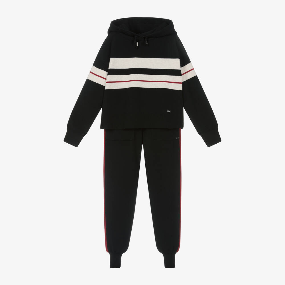A black tracksuit for older girls by Mayoral, detailed with logo plaques. Knitted in a soft mix with viscose, both are trimmed with beige and red stripes for chic, laid-back styling. The hooded top has faux drawstrings on the front and split details on the hem. The cuffed joggers have an elasticated waist, decorative drawstrings, and front pockets.
