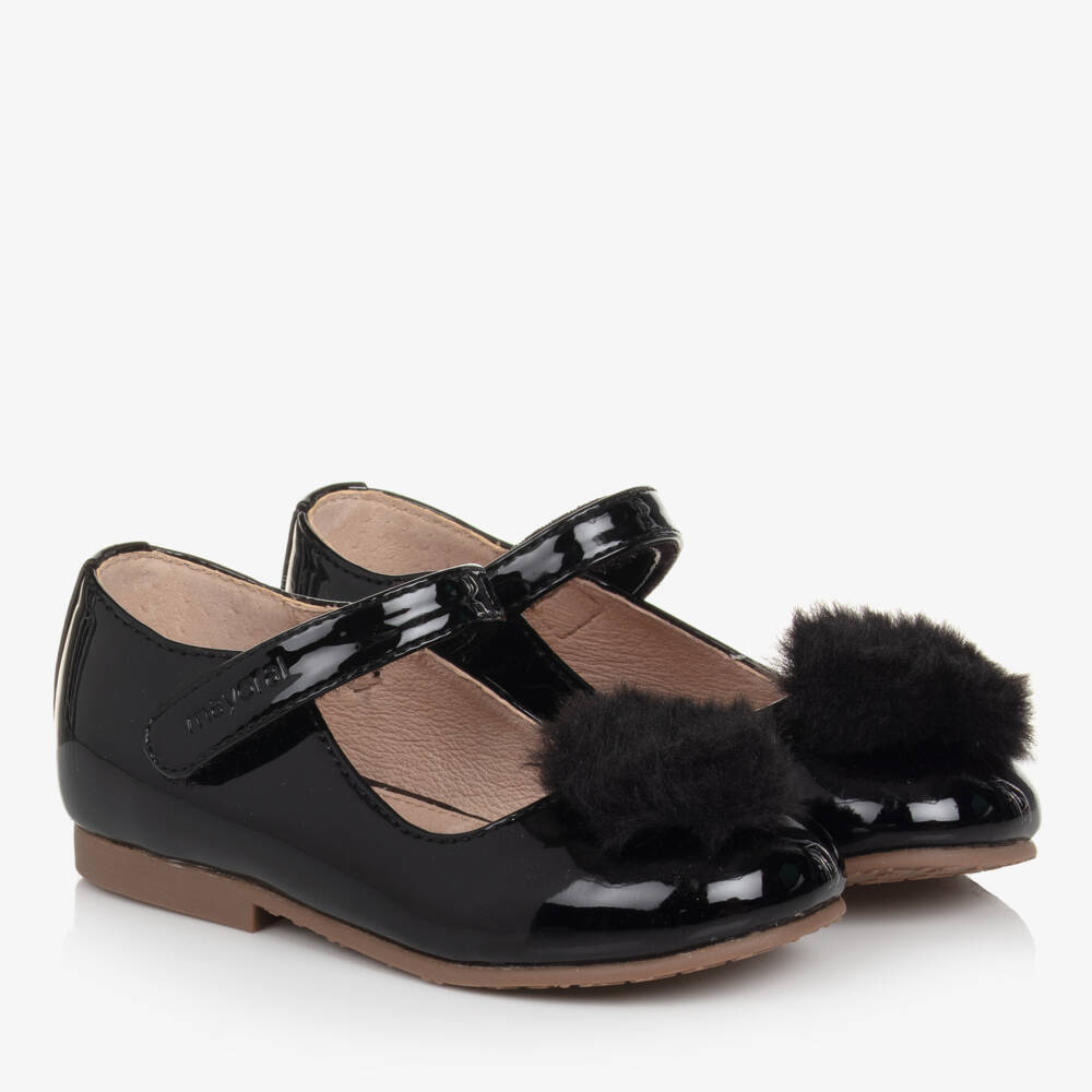 Charming black Mary Jane shoes for little girls by Mayoral, made from glossy faux patent leather. Embellished with an adorable pom-pom with a faux pearl centre on the toe, these shoes have practical velcro strap fastenings, subtly embossed with the brand name. They are lined in smooth leather and have non-slip rubber outsoles to ensure good grip.