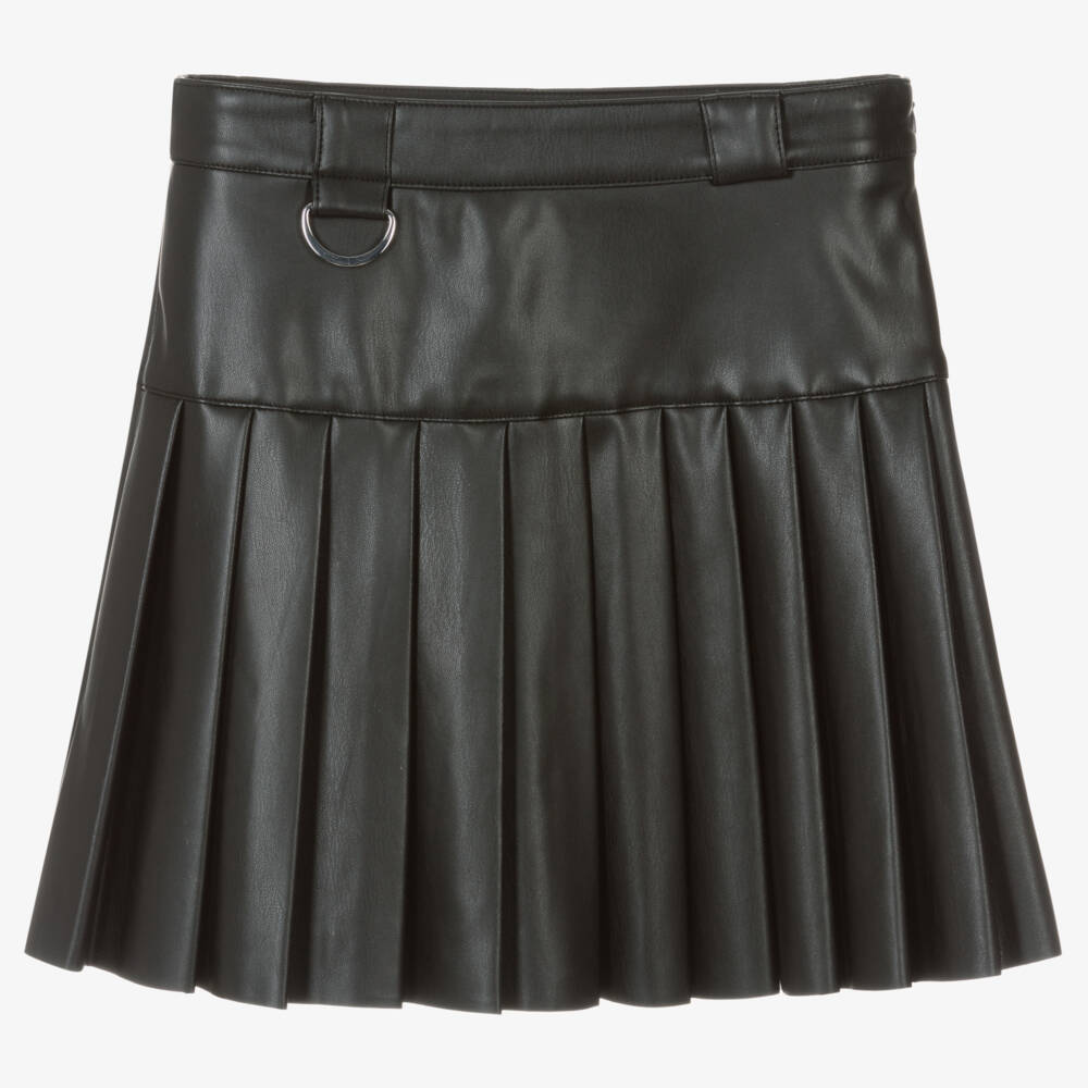 A black pleated faux leather skirt for girls by Mayoral, soft and stretchy for comfort. This skirt has belt loops, a silver D-ring detail and an easy-to-fasten zip on the side.