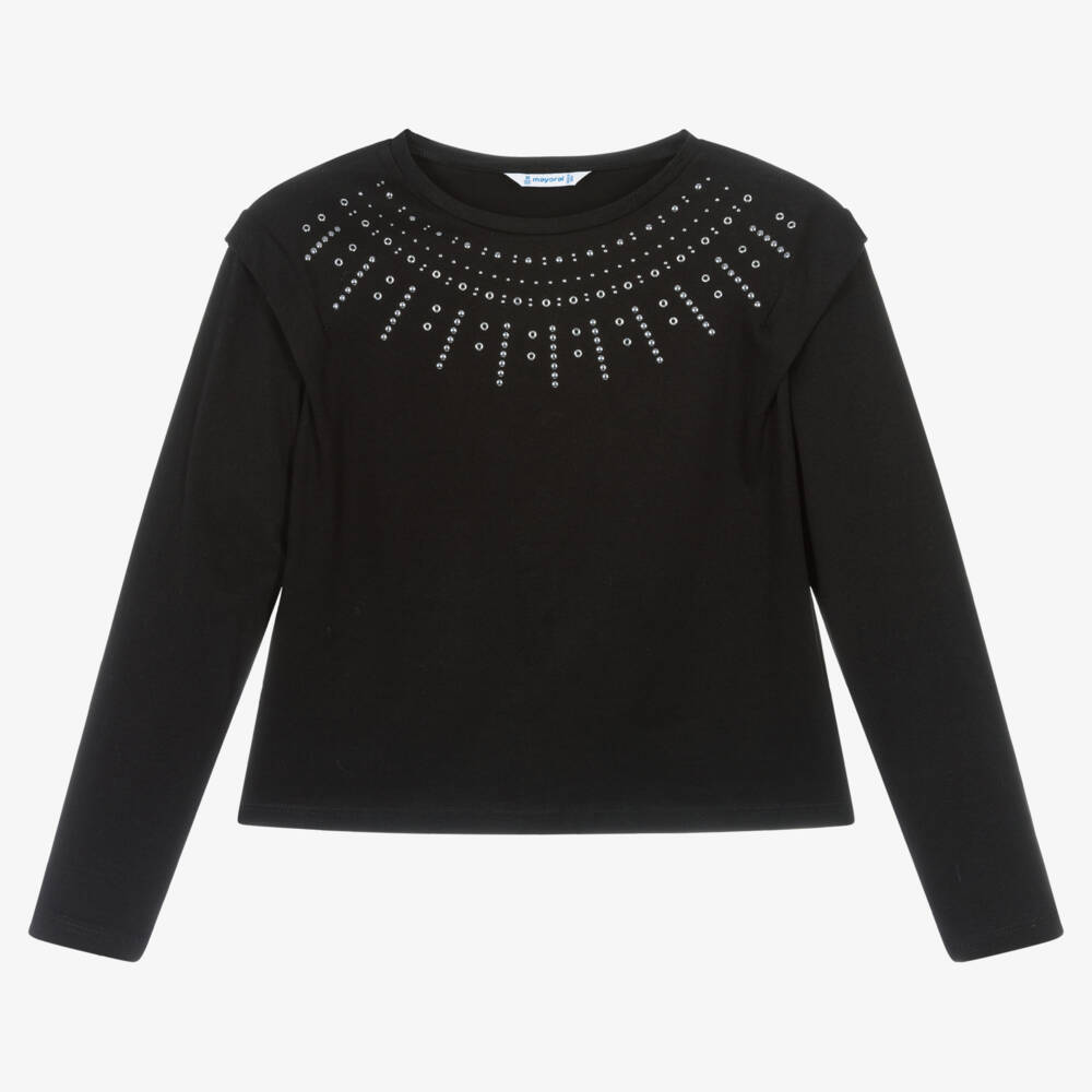 A black T-shirt for girls by Mayoral, made from soft and stretchy cotton jersey. This casual long-sleeved tee has silver studded detailing on the front, with a folded pleat on the shoulders for added shape.
