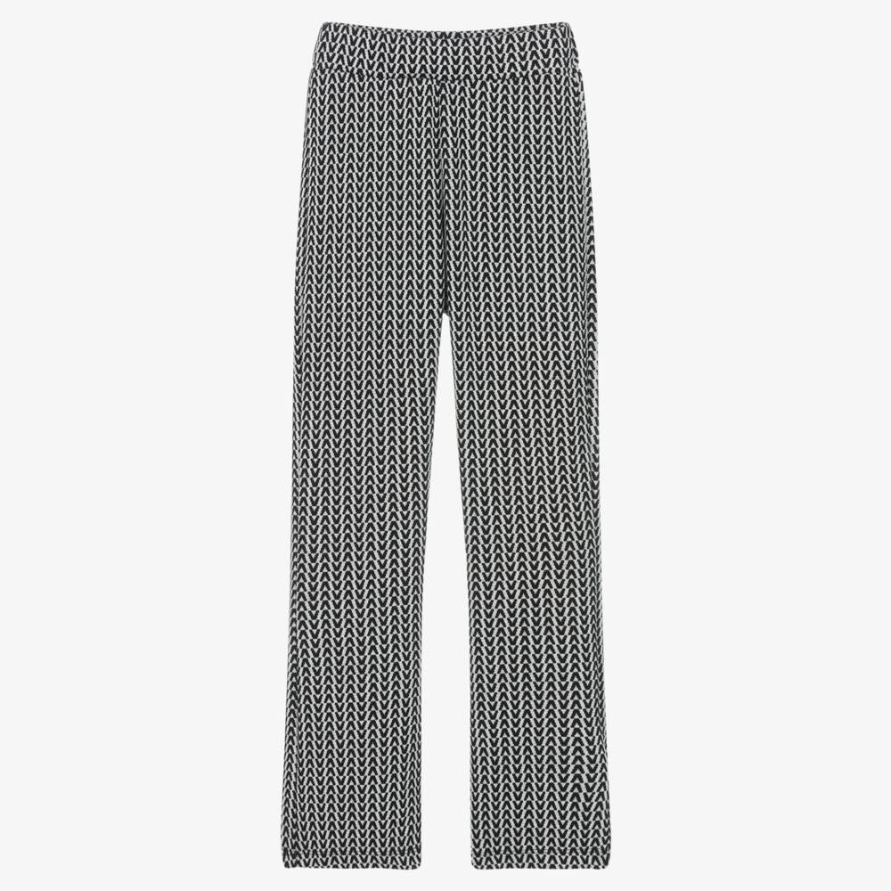 Trendy black and white knitted trousers for girls by Mayoral, with a slightly flared retro silhouette. Made from a soft viscose blend, they are patterned with a geometric V-shaped design and have a comfortable elasticated waist.