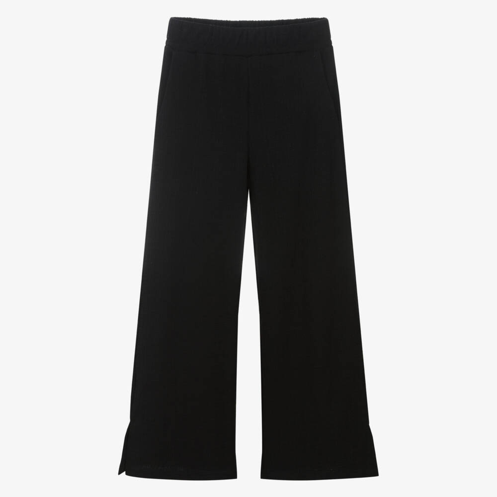 Black wide leg trousers for older girls by Mayoral, simply styled with slanted front pockets. Effortlessly stylish yet comfortable to wear, this pull-on style is made in soft cotton blend jersey with a waffled pattern and side vents.